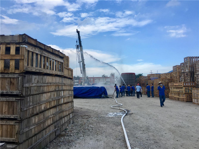 模擬火災(zāi)現(xiàn)場消防演習(xí)設(shè)定30畝產(chǎn)品堆放區(qū)為著火點(diǎn),分為四個(gè)組配合完成任務(wù)。第一組(滅火組)快速趕到事發(fā)地切斷電源,組員接好水帶水槍,用滅火器滅火;第二組(人員疏散組)組織疏散現(xiàn)場周圍人員,沿出口指示方向撤至一樓安全地方,保證樓道暢通,防止踩踏事故;第三組(人員物資搶救組)配合滅火組清理現(xiàn)場周圍物品,開辟防火隔離帶,救護(hù)傷員,用人工呼吸作簡單救治;第四組(照明、通訊組)配合其他三組負(fù)責(zé)場地照明、報(bào)警、模擬說明地址接警車、保證車道暢通到事發(fā)現(xiàn)場,滅火后留現(xiàn)場值班,防止二次火災(zāi)發(fā)生。