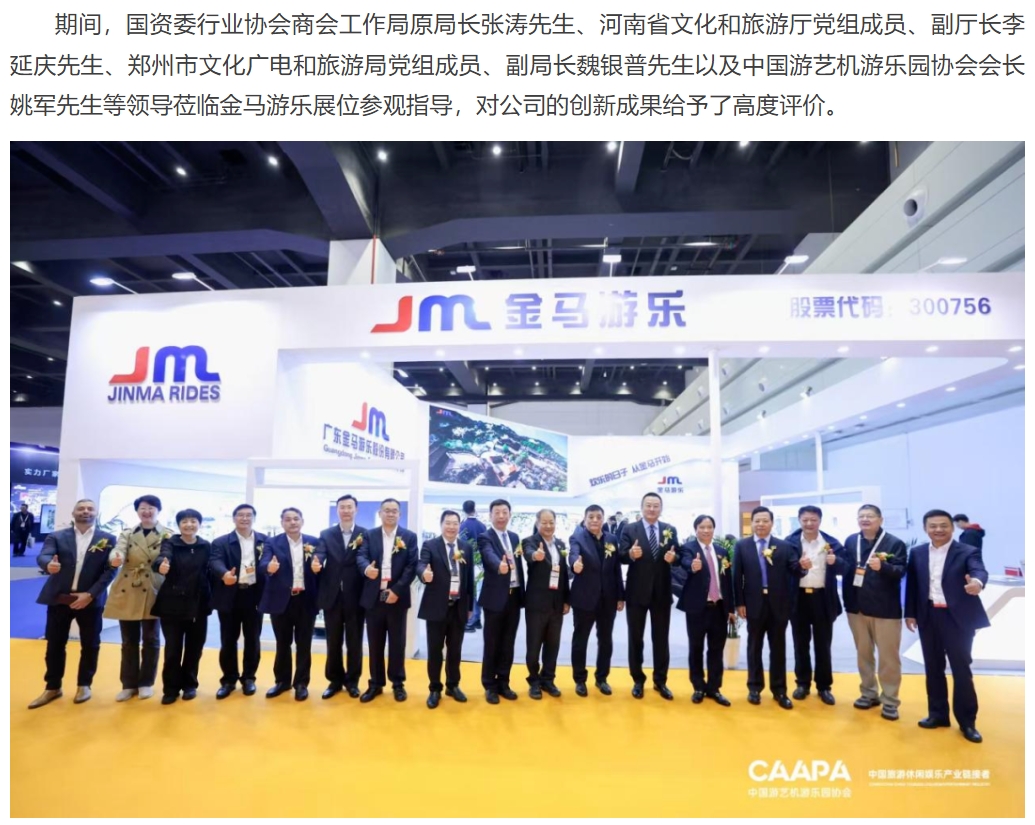 10月24-26日,由中國游藝機游樂園協(xié)會(CAAPA)主辦的2024中國(鄭州)旅游休閑娛樂產(chǎn)業(yè)博覽會在鄭州國際會展中心舉行,本次博覽會及相關(guān)活動,旨在進(jìn)一步推動文旅休閑娛樂行業(yè)的發(fā)展與繁榮,促進(jìn)文化旅游與多業(yè)態(tài)深度融合,助力旅游業(yè)現(xiàn)代化建設(shè)和高質(zhì)量發(fā)展。公司董事長鄧志毅先生與眾多行業(yè)領(lǐng)導(dǎo)、嘉賓共同出席了開幕儀式。