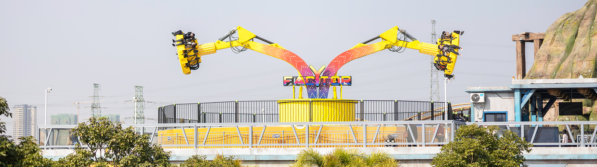 繞垂直軸旋轉、座艙繞支臂軸旋轉的陀螺類游樂設施;大臂向上拉升,到達上限位置后,座艙旋轉;傾斜運行、俯瞰大地,體驗翻倍;
