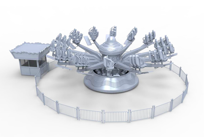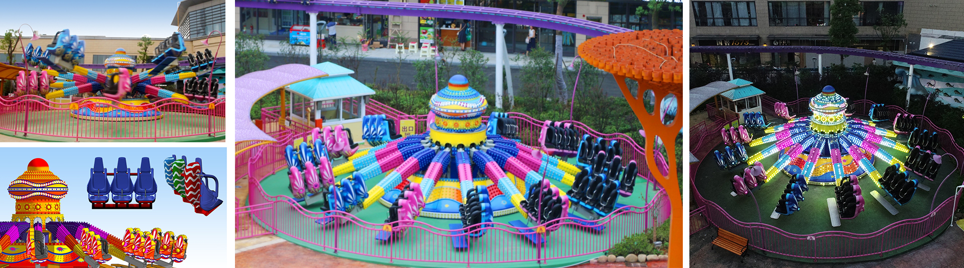 彈跳機(jī)中軸為中心帶動(dòng)周圍十四個(gè)座艙繞豎直中軸旋轉(zhuǎn),同時(shí)座艙伴隨著音樂進(jìn)行高低、快慢不同的跳躍式運(yùn)動(dòng)。使乘客在過程中體驗(yàn)到旋轉(zhuǎn)加跳躍的樂趣。