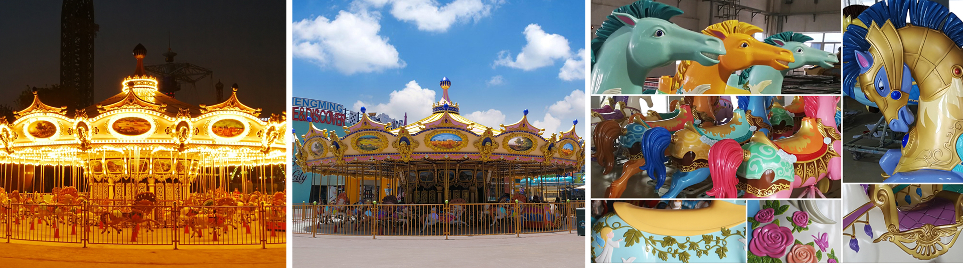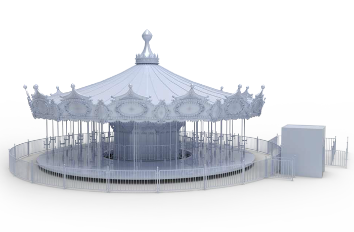 豪華轉(zhuǎn)馬采用歐洲皇家的古典豪華的裝飾風(fēng)格,頂棚華麗,內(nèi)外圍板鑲嵌著彩色浮雕和絢爛彩燈,馬匹及宮庭式馬車結(jié)合多彩的花飾,造型精致夢(mèng)幻。