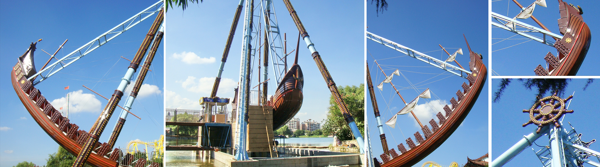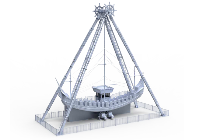 海盜船繞水平軸來回?cái)[動(dòng),模擬海盜乘風(fēng)出海的場景,交替而至的失重 和超重感讓乘客盡情體驗(yàn)搖擺的樂趣。14排座椅,承載56人。