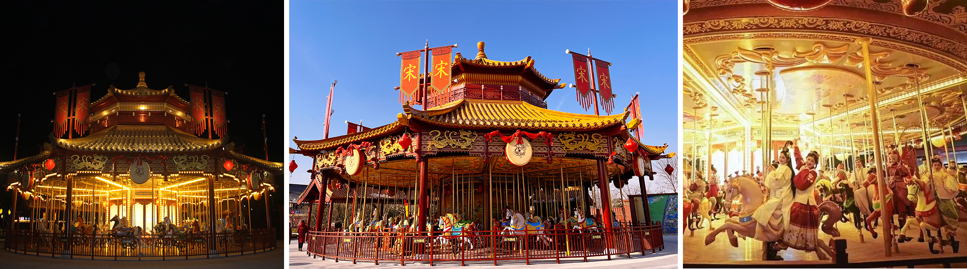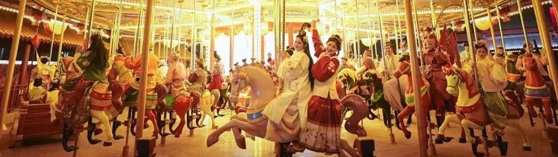 設(shè)備通過宋代的建筑整體風格包裝,岳飛的千里骕骦駒帶領(lǐng)岳家軍的軍隊排兵布陣陣列,宋、岳軍隊集結(jié)的陣式蓄勢待發(fā)。以現(xiàn)代生動的雕刻繪畫手法適當?shù)目ㄍㄉ时磉_馬匹造型,符合家庭親子游客的游玩審美趣味。讓乘客化身為“背嵬軍”隨岳飛出征北伐,體驗馳騁沙場的感覺。浮雕和絢爛彩燈,馬匹及宮庭式馬車結(jié)合多彩的花飾,造型精致夢幻。