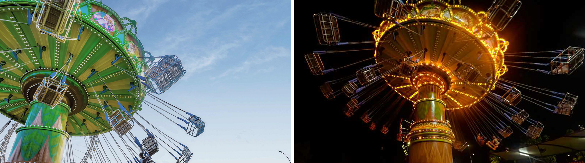 颶風(fēng)飛椅設(shè)備通過傘形轉(zhuǎn)盤的旋轉(zhuǎn)和中間轉(zhuǎn)臺的錯位旋轉(zhuǎn),實現(xiàn)飛椅的波浪式運(yùn)動,乘客猶如在空中自由飛翔飄蕩。此款飛椅設(shè)有2人座艙,適合家庭親?或情侶游客游玩。